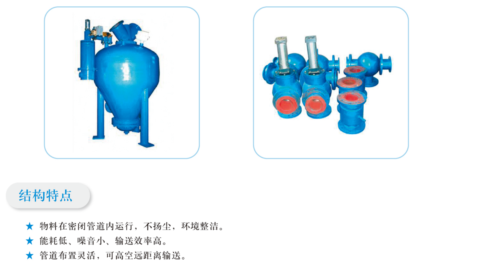 該裝置屬于密相中壓氣力輸送,實用于不易破碎顆粒、粉狀物料的輸送。廣泛應(yīng)用于鑄造、化工、醫(yī)藥、糧食等行業(yè)。該裝置配備了包括特種耐磨球形彎頭,球形三通,球形卸料器等完整的管路系統(tǒng),靈活可靠的氣路系統(tǒng)及電控系統(tǒng),可以方便的實現(xiàn)多卸料點的順序或選擇輸送,安裝方便。