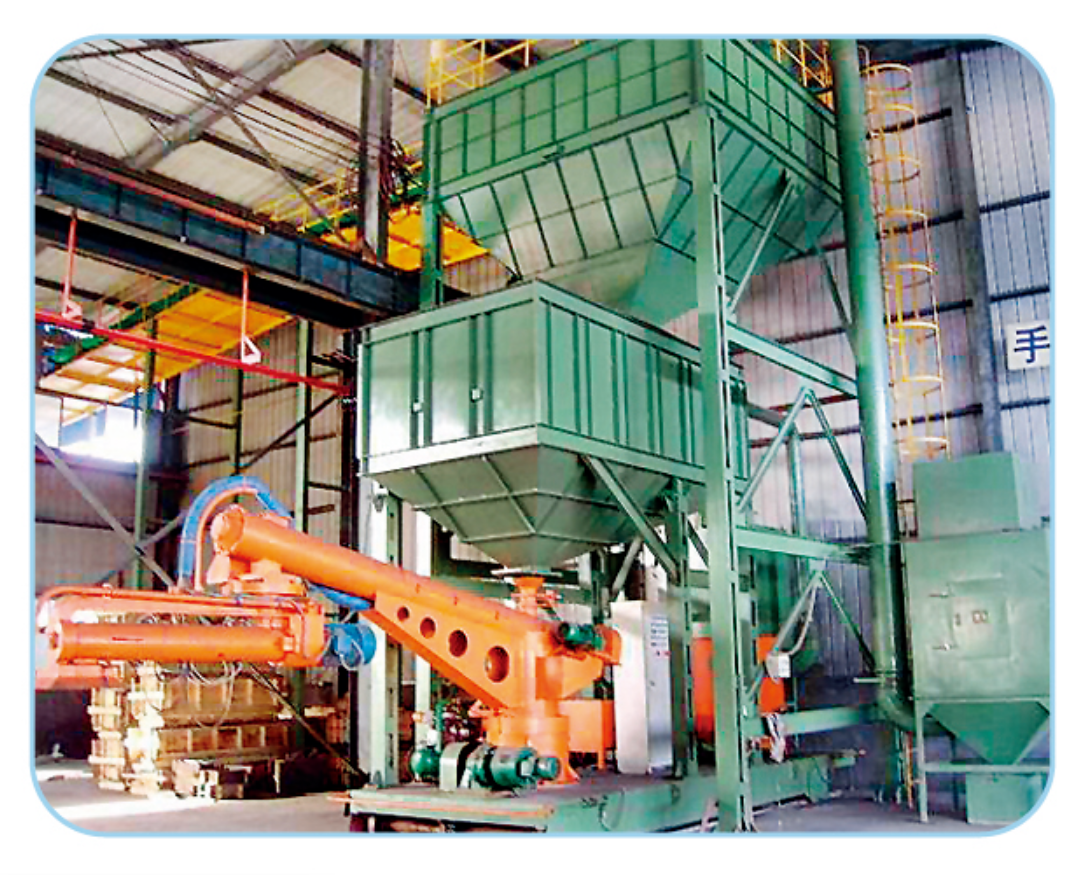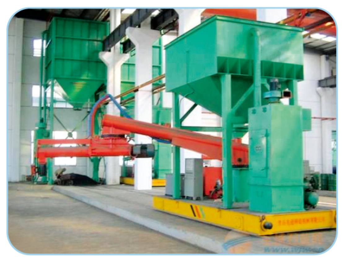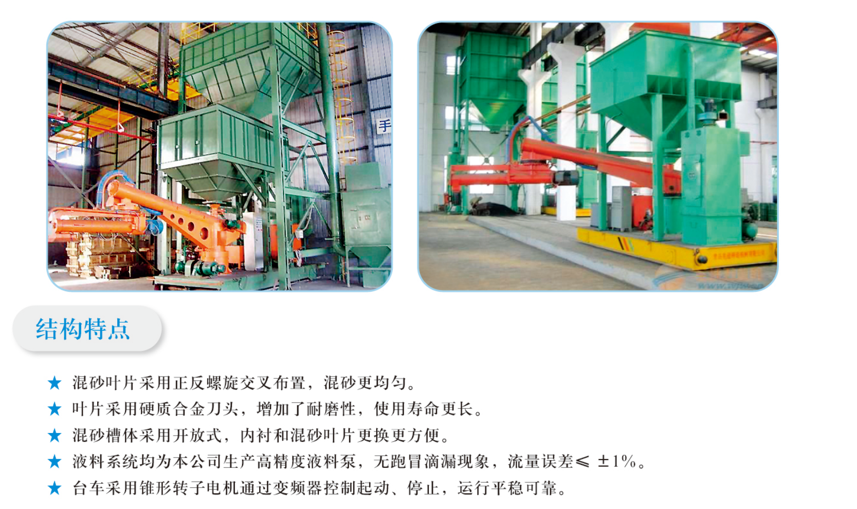 該裝置為移動(dòng)式雙臂中速混砂機(jī),用于混制呋喃型樹(shù)脂自硬砂,該機(jī)操作方便,適用于大面積、中大型鑄件的混砂造型,與相應(yīng)輔機(jī)配合可以組成中大件造型機(jī)械化流水線。該機(jī)器由臺(tái)車、機(jī)座、大臂螺旋輸送、混砂槽、及液料系統(tǒng)和氣控系統(tǒng)組成,混砂槽和大臂均可機(jī)動(dòng)回轉(zhuǎn),保證足夠的造型覆蓋面積。