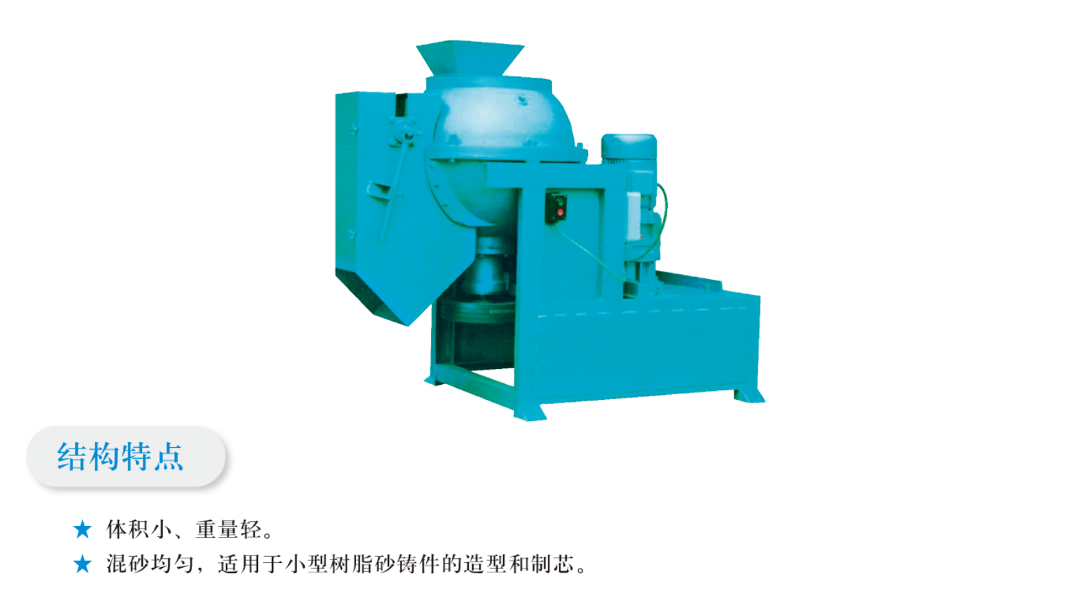 該系列混砂機為間歇式工作,混砂過程在球形容器中完成,利用兩牛角葉片將砂連續(xù)翻轉(zhuǎn),給上半球的反射擋板回推,將砂充分攪拌均勻。本機適用于樹脂砂的造型、制芯,根據(jù)用戶需求也可做成自動加砂、液料。