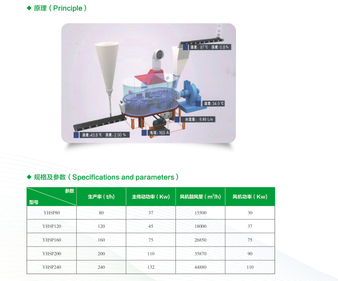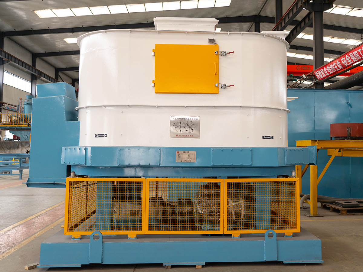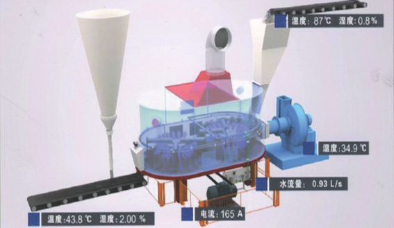 當(dāng)冷卻系統(tǒng)開始工作時(shí),控制系統(tǒng)首先檢測舊砂溫度和濕度,并據(jù)此確定出加水量,舊砂進(jìn)入盤內(nèi),在攪拌器和風(fēng)力的帶動(dòng)下,舊砂在水平和垂直兩個(gè)方向立體運(yùn)動(dòng)。與此同時(shí),加水系統(tǒng)將確定的加水量均勻地噴撒在舊砂中水份蒸發(fā)帶走大量的熱,蒸發(fā)的熱汽被迅速抽出,進(jìn)入除塵系統(tǒng),在冷卻器攬拌冷卻的過程中,系統(tǒng)安裝的溫度、濕度檢測裝置,連續(xù)檢測監(jiān)控舊砂溫度、濕度的變化、同時(shí),連續(xù)檢測攪拌電機(jī)的工作電流來調(diào)整出砂門的開度以保持冷卻器內(nèi)砂量的穩(wěn)定,通過檢測出砂溫度及水份,反饋加水控制系統(tǒng),調(diào)整加水量,保證出砂的溫度控制在45度(夏天環(huán)境溫度+10度)以內(nèi),并精確控制水份在2±3%。